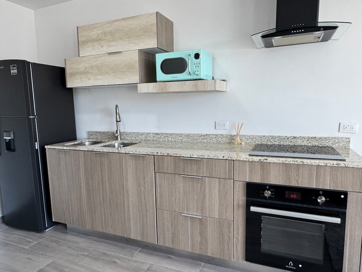 Modern apartment located in the exclusive sector of San Felipe. It is part of a new development with an elevator right at the apartment door. Enjoy a comfortable stay with a king-size bed, washer-dryer, refrigerator, and a small exercise area ideal for maintaining your routine. The kitchen is fully equipped for short or long stays. Perfect for those looking for comfort, style and an excellent location in Chihuahua.