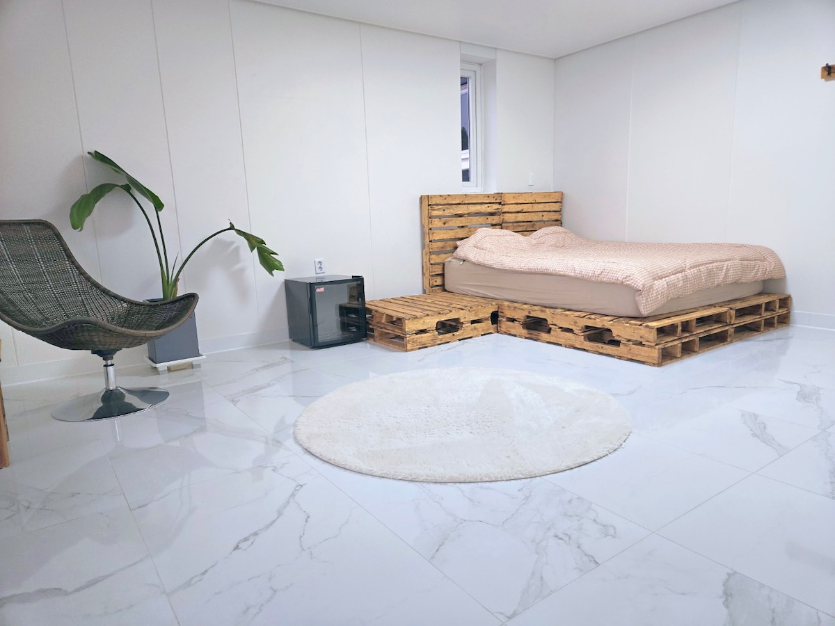 This is a 1000m2 private house on a 770m2 site. All materials in the interior are made of imported European timber and materials, making it a unique and beautiful private pension. 90-inch large TV with Netflix. You can watch YouTube and of course Wi-Fi is available. The bedroom is equipped with a super queen size bed, and a folding mattress and bedding are also provided. There are 2 bathrooms, a spacious living room and dining room, and a fridge, induction (1 each for 2 and 1 burner), microwave, coffee pot, etc. The 330m2 lawn garden will be a great place to play, even when you are with children, as it is the place where 4 adults feel the most comfortable. I'll be a rabbit house stay to give you a peaceful and cozy space for both families and couples~^^
