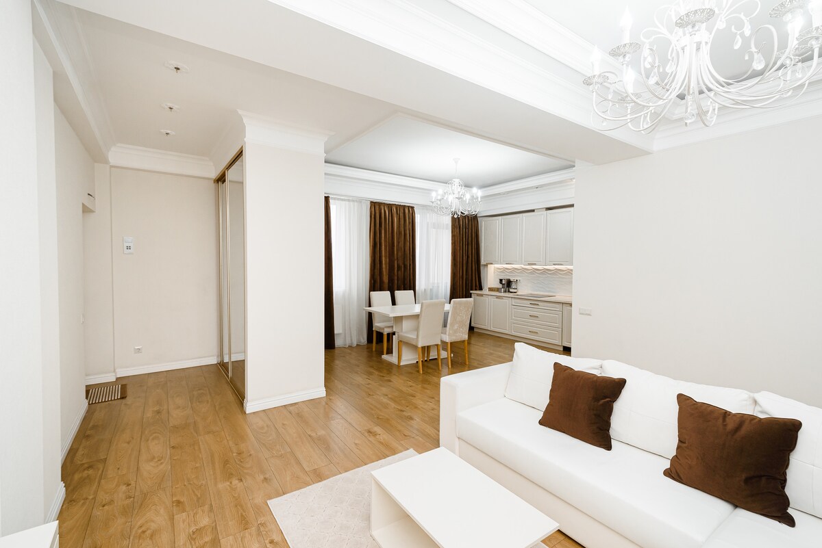 apartments in the city center. On the fourth floor. House with an elevator. Beautiful interior design. Separate bedroom with a queen size bed and the most comfortable mattress. Fully equipped kitchen with all the utensils for cooking. Convenient location, close to shops, restaurants, shopping centers, a cinema, a park. Literally across the road in 2 minutes walk is the largest Hypermarket in Moldova Nr. 1, Also the restaurant Andys and Taxi Blues Shooing MollDova in 5 minutes walk. Nearby park