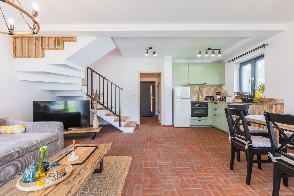 We invite you to a unique cottage located right next to the forest and lakes - it is the perfect place to slow down, breathe fresh air, enjoy the silence and fully relax. Comfortable for 2-4 people. Our cottage has been decorated with comfort, warmth and harmony in mind. Outside, there is a large terrace overlooking the forest, a perfect place for morning coffee or yoga in the background, listening only to the birds singing. This is a place for those who are looking for silence, closeness to nature and moments of true rest.