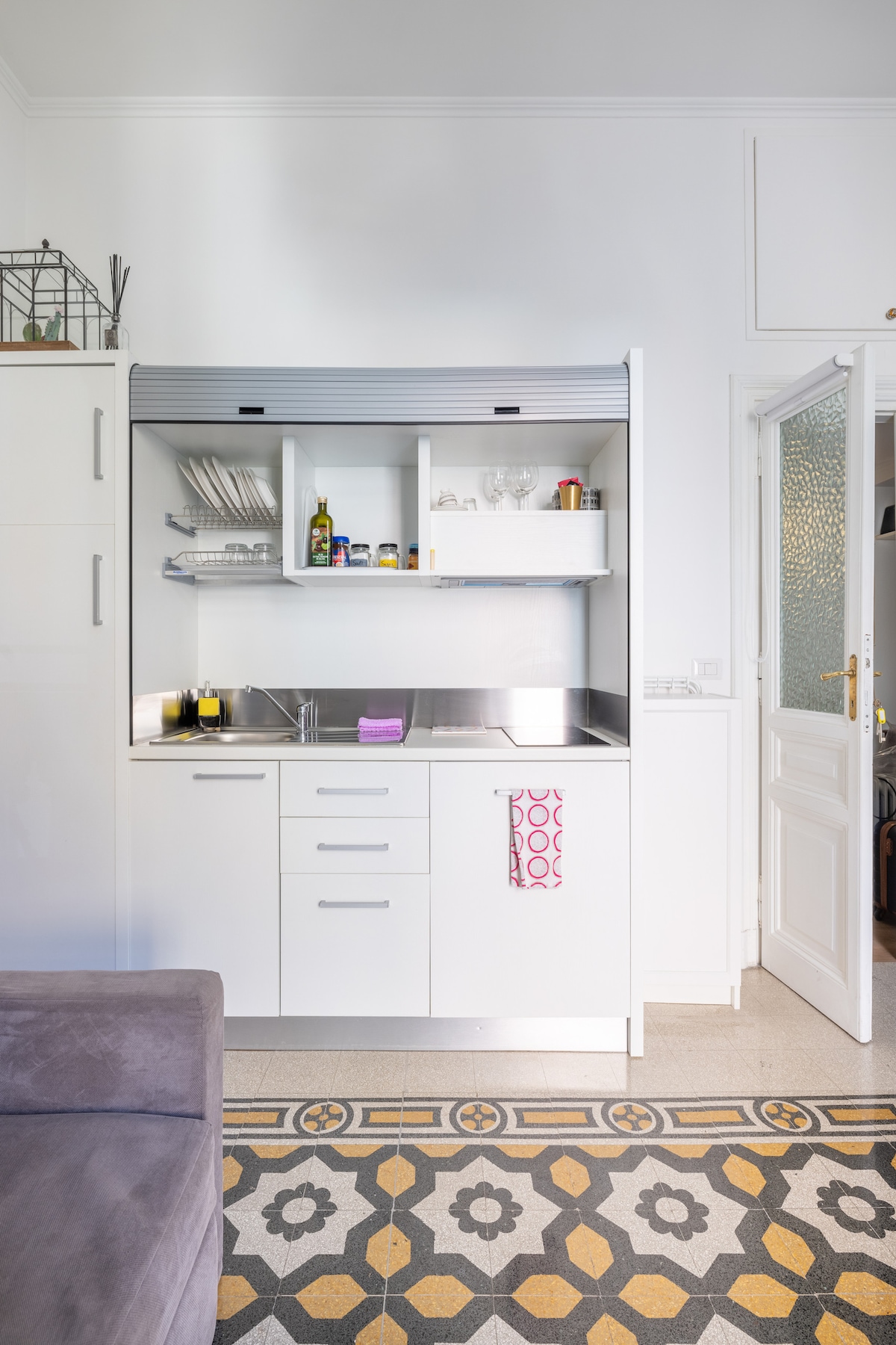 The apartment with terrace, located on the 8th floor of a historic building, equipped with an elevator, has just been renovated and finely furnished. Consisting of a living area with a sofa, smart TV with various Netflix and Amazon Prime services, and a nice coffee table. -The small kitchenette is fully equipped with every useful utensil, microwave, fridge freezer and kettle. Air-conditioned, with heating and air conditioning, it has powerful free Wi-Fi that can be used in every area of the house.
