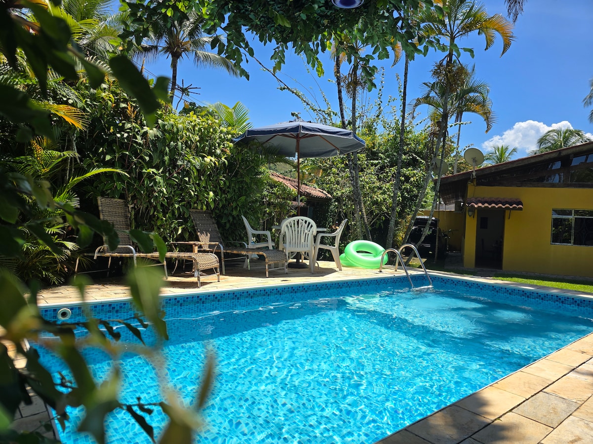 Curta com toda a família em alto estilo Casa térrea confortável em amplo jardim com piscina Conforto e sossego a 5 minutos caminhando até a bela e calma praia das Cigarras - São Sebastião Decoração aconchegante, cozinha equipada, área gourmet e churrasqueira 2 quartos aconchegantes para 6 pessoas Suíte com cama de casal e quarto com camas solteiro + camas auxiliares e 2 banheiros Ar-condicionado, TV e WIFI de alta velocidade Roupa de cama e banho para 6 pessoas