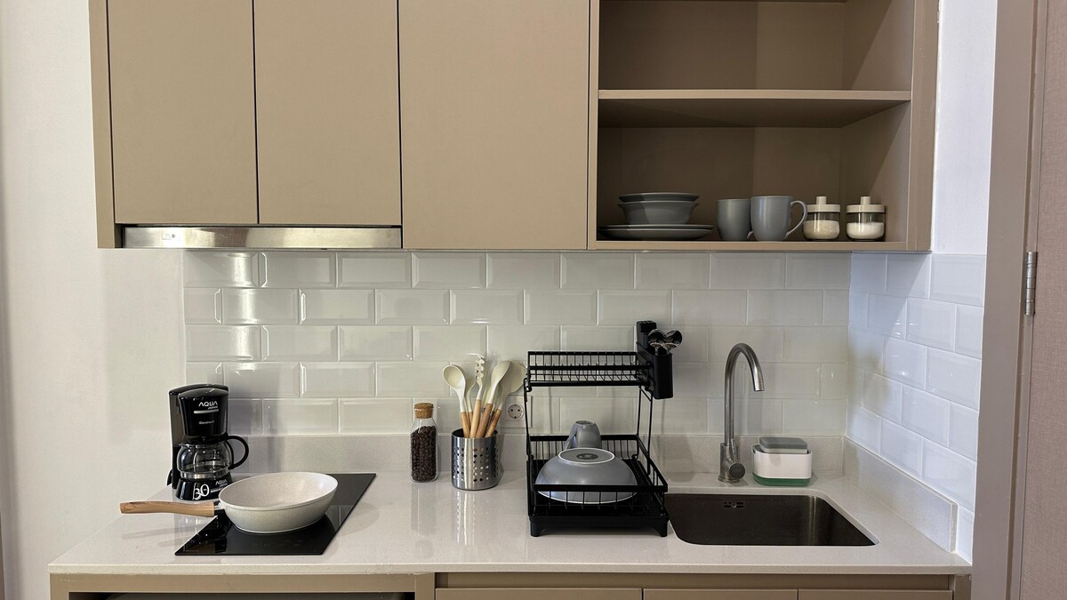 Brand-new 1BR (not studio) Japandi-style apartment (35 m²) with city views, located above K Mall at Menara Jakarta, just 150 m or 5-minute walk to JIExpo Kemayoran. Located in Central Jakarta, 11 min to JIS, 20 min to Grand Indonesia, and 5 min to the toll road. Features a Queen bed (160×200), 2 A/C units, WiFi, kitchenette, 50” Google TV, water heaters, and laundry. Enjoy pool, gym, lounge, coworking space, sports courts, and kids playground. Ideal for 2 guests.