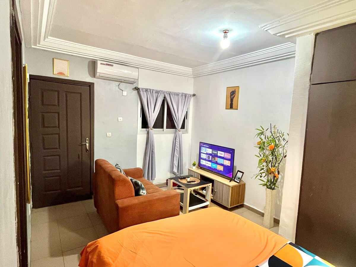 ★ ”..Alains Apartm. is well situated, he is a care taking..” Hortense ☞ 32” HDTV ☞ 50MBs Wi-Fi ☞ 7/7 Security Guard ☞ Water cooker for hot showers ☞ Air-Conditioner ☞ Free Parking » 9min drive to Kafolo Lagoon » 7min drive to Carrefour market » 30min drive to Airport Add my listing to your wishlist by clicking ❤️ the in the upper-right corner. If you have a 2+ reservation, you will need to use more furnitures than the bed. Don't worry we will show you how to use the other sleeping places.