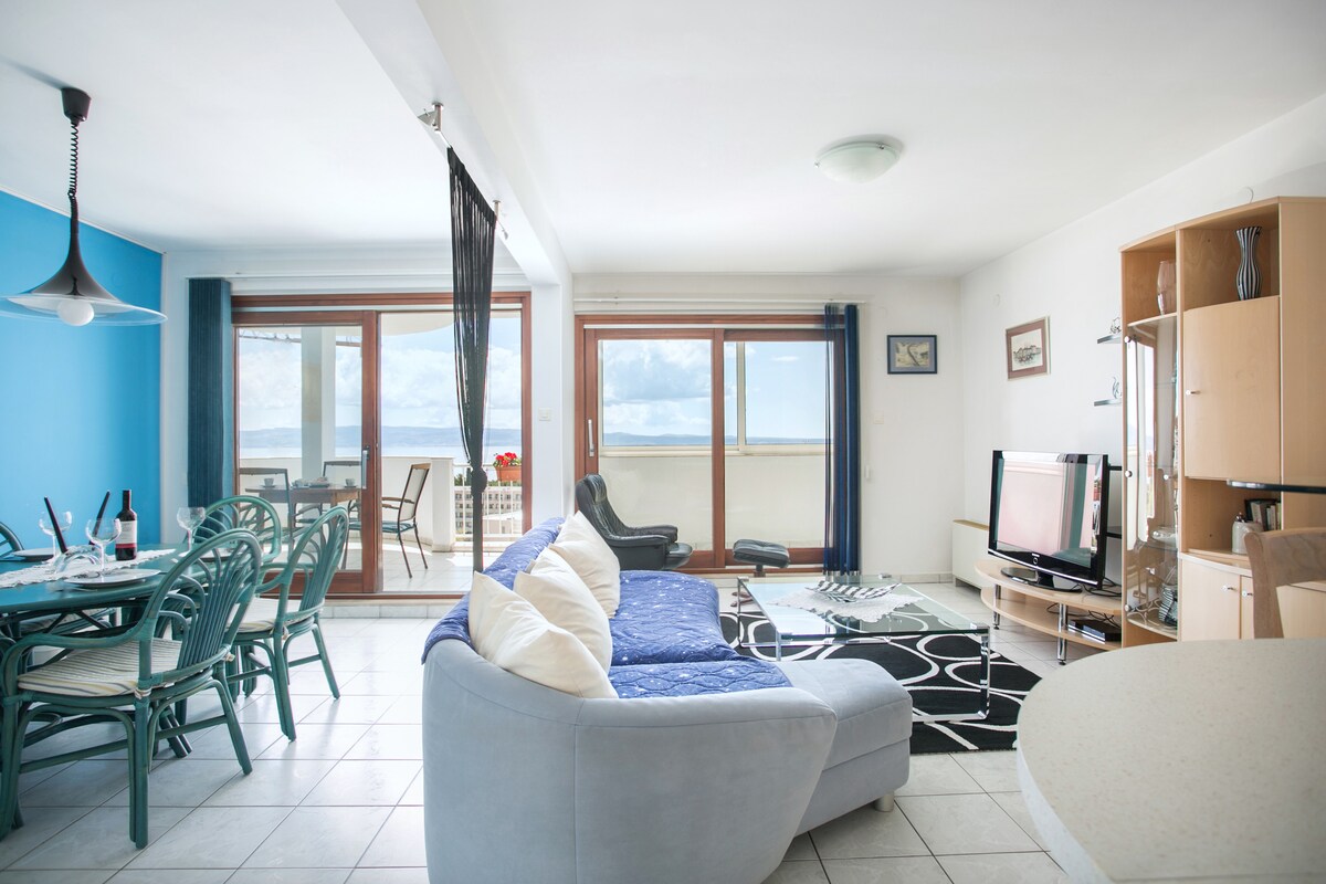 This beautiful 4 stars sea view 1st floor apartment with it's 80 m2 living area, provides 2 bedrooms, 2 full bathrooms, spacious living room with pull out sofa and big 20 m2 balcony with fantastic view of Adriatic sea and islands. Each bedroom has it's own full bathroom which is perfect for people who want to stay together but still having privacy, such as couples or families with children. Each room has air condition. It is located in quiet neighborhood and comes with a private garage.
