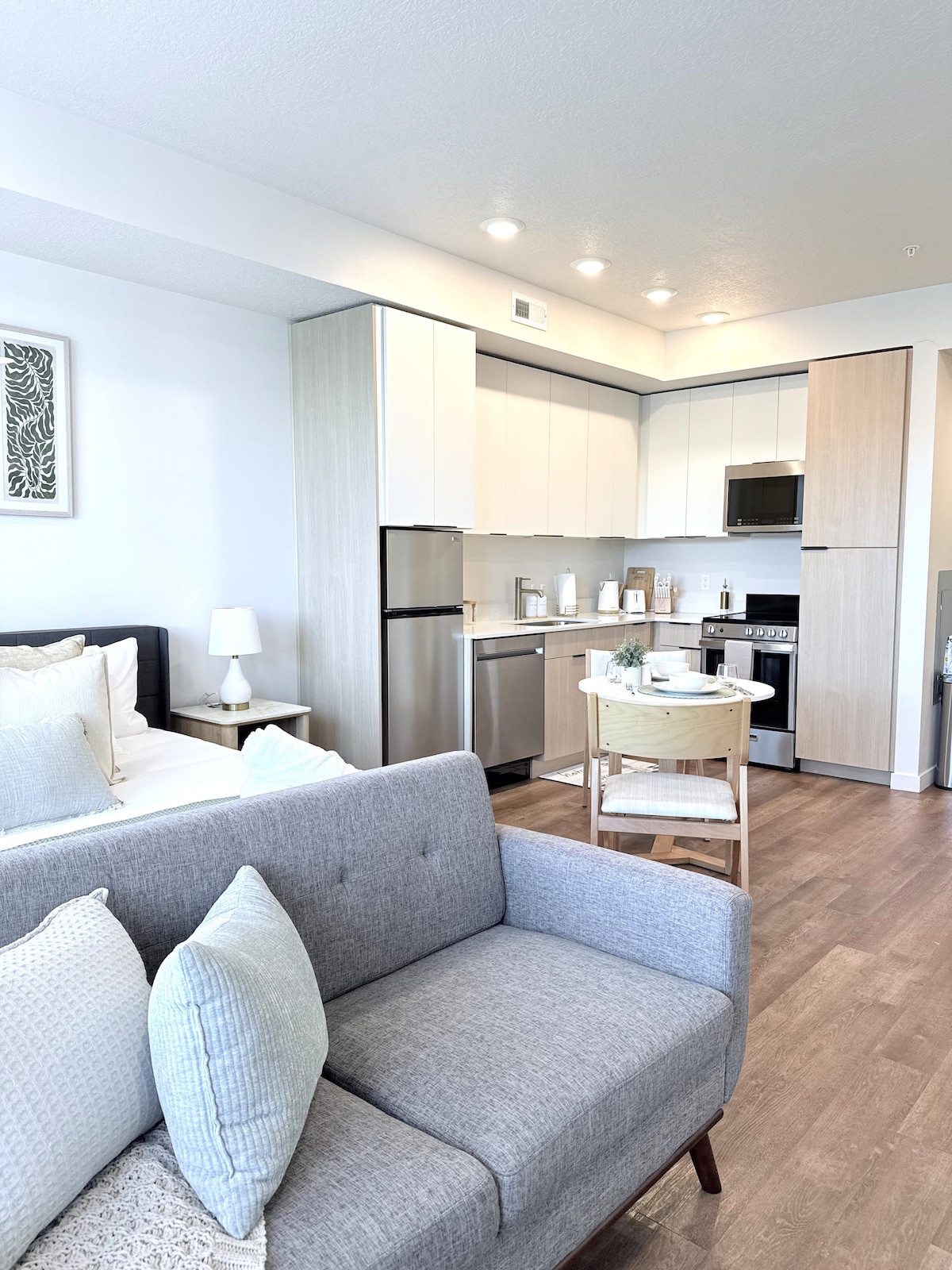 Enjoy a comfortable and modern stay in this centrally located downtown apartment. Thoughtfully designed with a plush king bed, open living space, full kitchen, and dedicated workspace, it’s perfect for business or leisure travelers. Guests also enjoy access to premium building amenities including a pool, hot tub, and fully equipped gym. Walkable to dining, coffee shops, and entertainment, with easy freeway access for exploring the city.