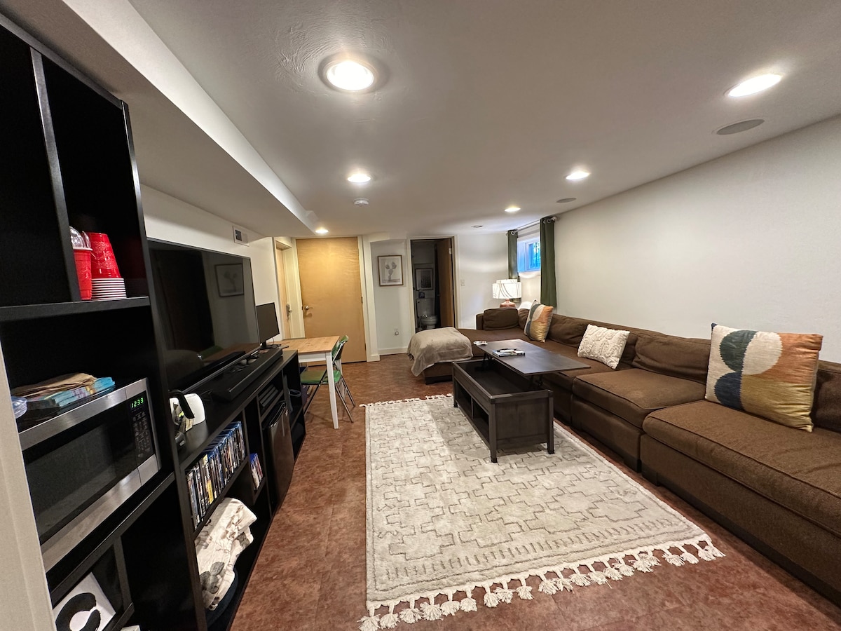Entire space is very private. Enjoy the cozy modern 1 bedroom queen bed, 2 large sofas that are comfortable to sleep on, oversize soaking tub large walk-in closet , 2 TVs, Blue Ray player, stereo, gorgeous private garden with table seating & tranquil water feature, & private entry. 5 minute drive to downtown, 2 minute walk to Forest Park & Marquam trails. Several amazing restaurants just minutes away. There is a pet fee of $40 each pet. Preferably just one pet or the fee is $70 for two.