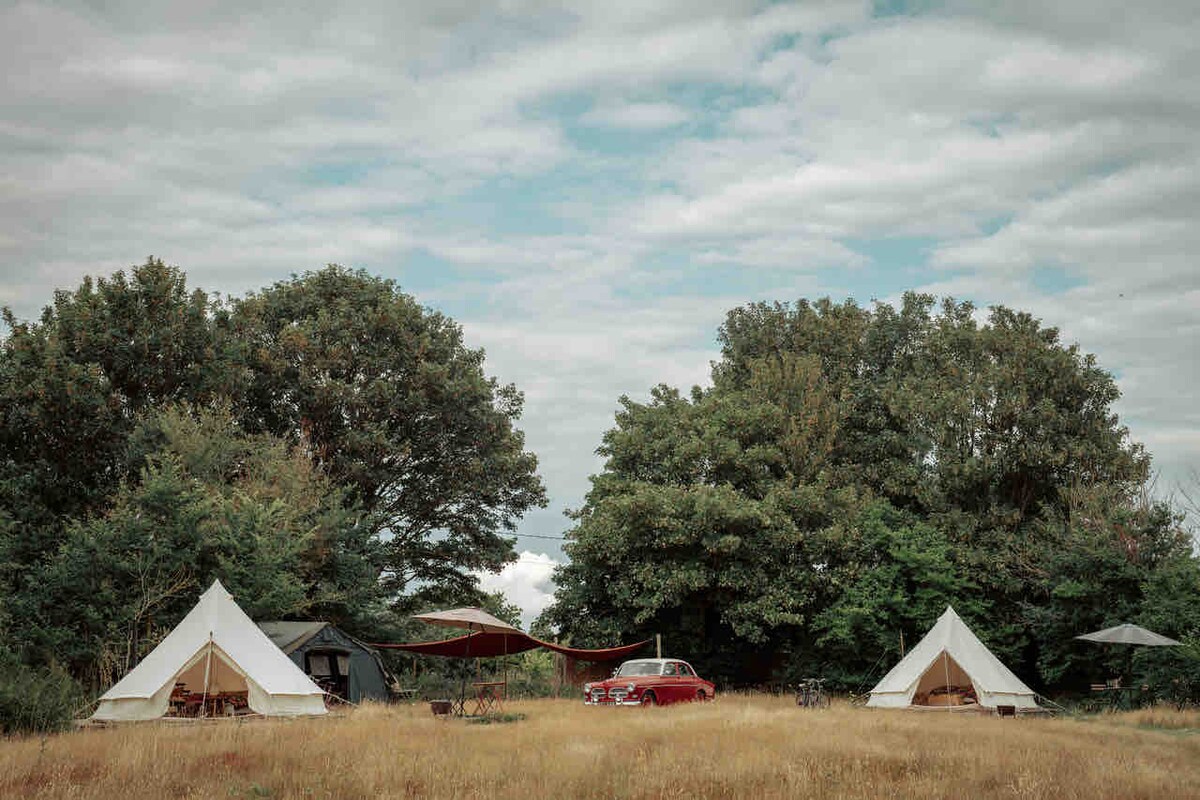 Here at the Suffolk Steel House & Glamping we have two luxury 5 metre Bell Tents available for you to enjoy. The tents are set in over 1/2 an acre of Suffolk countryside for you to enjoy. You will have access to the shared quirky vintage Rice Horsebox kitchen as well as your own private ‘Monty Don' inspired corrugated steel shed bathroom, where you will find hot & cold running water as well as flushing loos.
