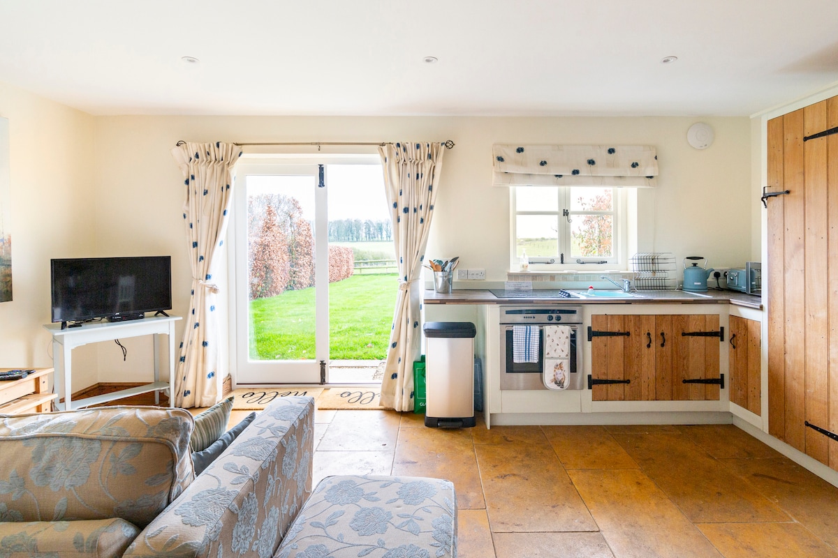 A spacious, light & airy ground floor studio apartment with separate shower room & underfloor heating, set in beautiful surroundings. The apartment is close to the Cotswold Farm Park, located in the grounds of a 48 acre livery business, the apartment has fantastic views across the lawns, to the horses in the paddocks and beyond. This apartment has a fully equipped kitchen and is decorated to give it a Cotswold farmhouse feel, it has it's own entrance, with off street parking.