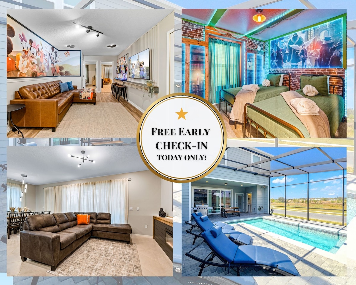 Magical 5BR Villa at Windsor Cay – Close to Disney! Enjoy luxury in our brand-new 5BR home! Kids will love our incredible Toy Story and Mickey & Minnie themed rooms. Relax in your private screened pool or enjoy the world-class Windsor Cay Resort, featuring a massive Lazy River, Water Slides, Tavern, and a huge Clubhouse Game Room. 15 min to Disney, 30 min to Universal ,Steps from luxury resort fun! Perfect for families. Book your dream vacation today!