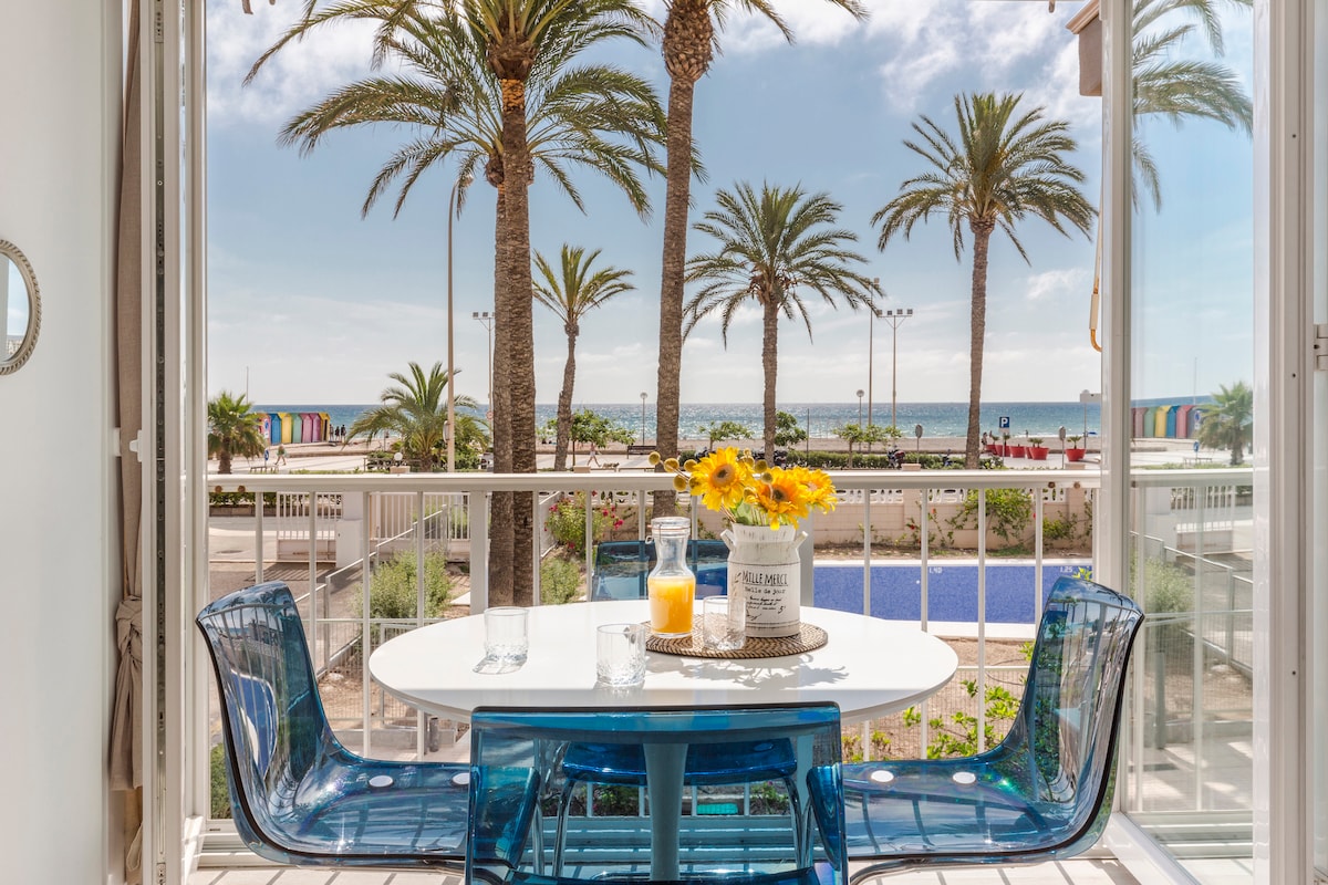Spectacular 120 meters on the beachfront recently renovated with dining room convertible into a 60 meter terrace, stunning views of the sea and the coast and chill-out relaxation area. Designer kitchen and 2 full bathrooms. All exterior, 3 very spacious and double bedrooms. Reverse osmosis water purifier. Direct access to the beach from the urbanization. Newly built swimming pool. Free parking. Kid-ready! License VT-463132-A