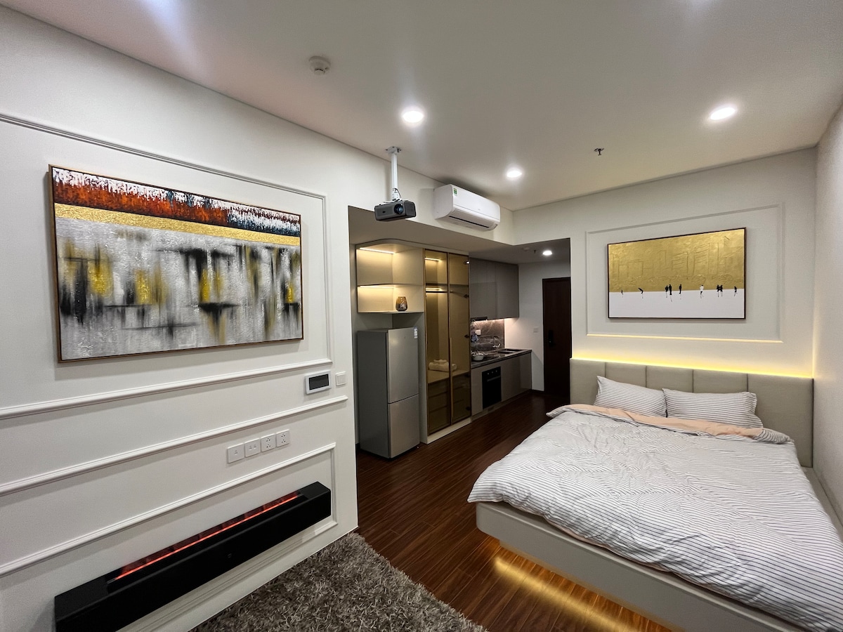 Căn phòng ngập tràn lãng mạn, tận hưởng netflix & chill Với thiết kế lấy tone trắng đen làm chủ đạo, decor thanh nhẹ với phong cách art châu Âu, cùng sắc đèn vàng ấm cúng, ban công hướng ra ngoài thành phố, máy chiếu có Netflix để chill buổi đêm, khu bếp nhỏ để tự nấu những món ăn thật ngon cho bản thân,...chắc chắn sẽ giúp bạn có những trải nghiệm chữa lành tâm hồn thật đặc biệt.