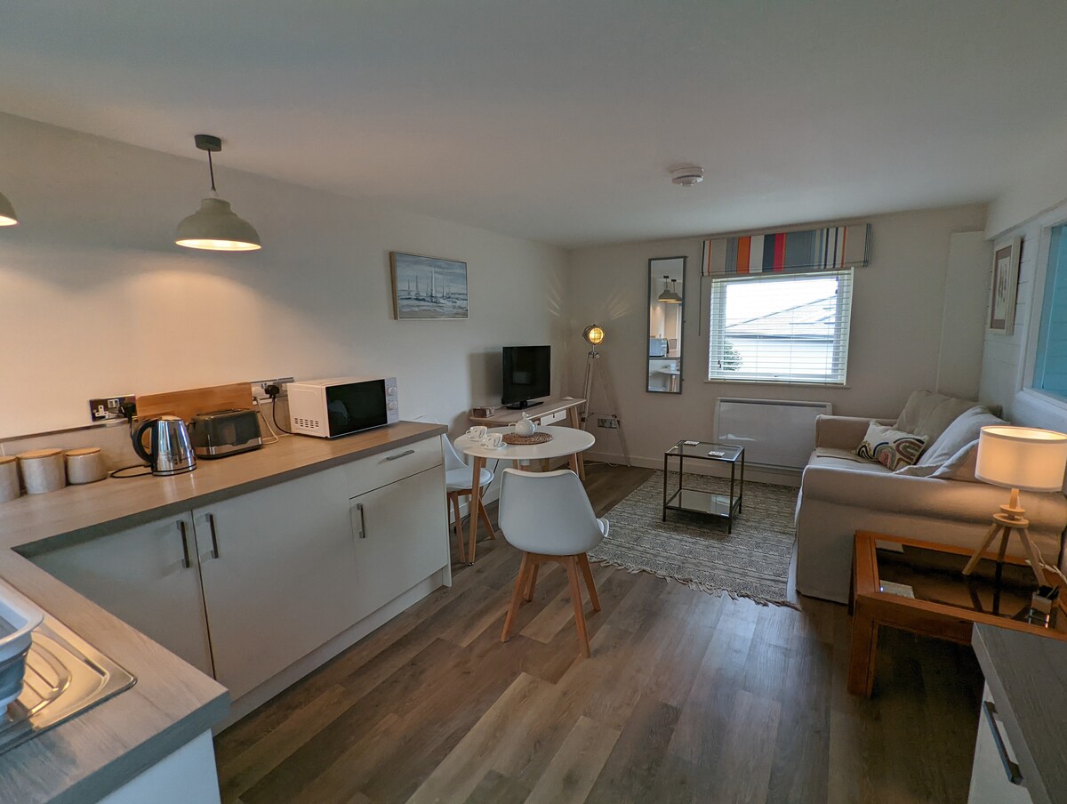 Our newly created bijou apartment is ideal for two people, although there's a sofabed should you wish to have two children staying too. We're a five minute walk to Dawlish town centre, the nearest beach and railway station. The kitchen is fully equipped with everything you need to self cater. The bed is a standard double with storage. The accommodation is not suitable for people with limited mobility. There are 12 steps down to the unit. Well behaved dogs are welcome. On-street parking.