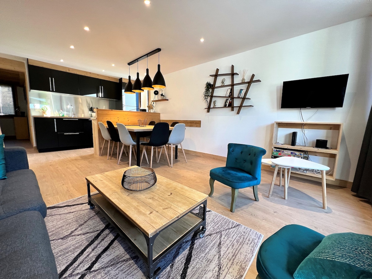 On the ground floor, 55 m2 apartment, south-facing, furnished in a style that is both modern and mountainous. View of the peaks. Spacious living room with sofa, 127 cm TV. 2 bedrooms with 160 cm beds, large closets and wardrobes. Bedroom with TV. Terrace and garden of 60 m2. For your comfort, in addition to the basic amenities, you will find a kettle, toaster, raclette/grill/pancake maker, croque-monsieur/waffle maker... End-of-stay cleaning is included.