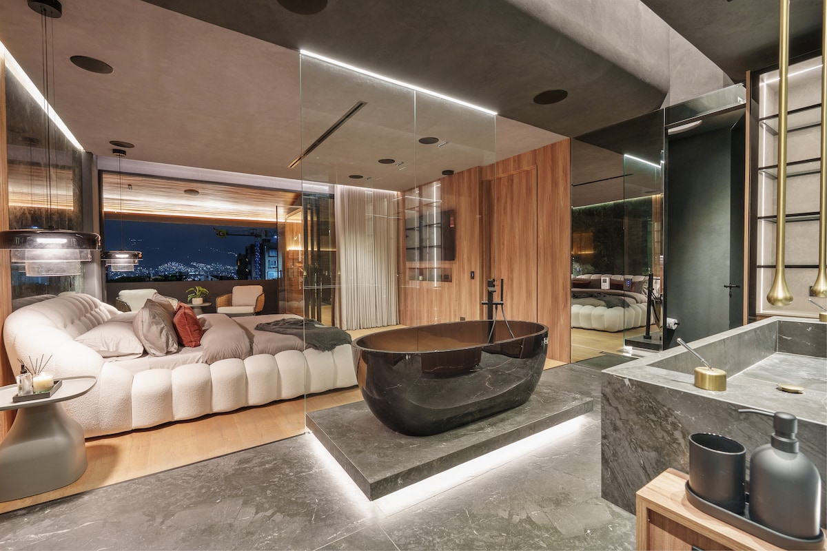Book this premium 21st floor apartment in El Poblado with private jacuzzi over looking Medellìn's skyline ! - Free on-site parking - Work-spaces with high speed WiFi - A/C in both bedrooms - 3 HD smart TVs - Netflix - Steam room - Swimming pool - Fully equipped gym - Restaurant & cafeteria - Free on-site washer/dryer - Tea/coffee station - Fully equipped kitchen - Spa - Pool table - Office space - Conference room - Private balcony - Easy access to JMC airport - Five mins drive to Parque Lleras