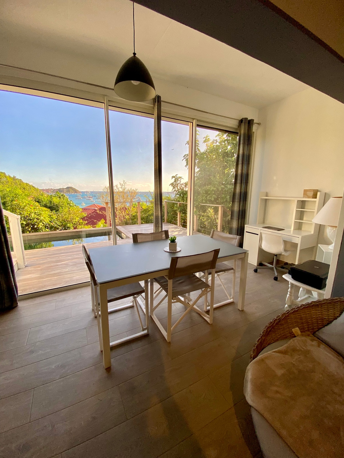 La Chaumière is a house full of charm. Perched on the heights of Colombier, quiet, offering 180° views of the island, its islets and the ocean. The accommodation is fully air-conditioned and has 2 bedrooms (bedroom 2 can be with 1 double bed or 2 single beds), 2 bathrooms and a living room. The spaces, kitchen, dining room, reading area, deckchairs, jacuzzi and BBQ, are arranged around the house, to enjoy the places at every moment of the day.