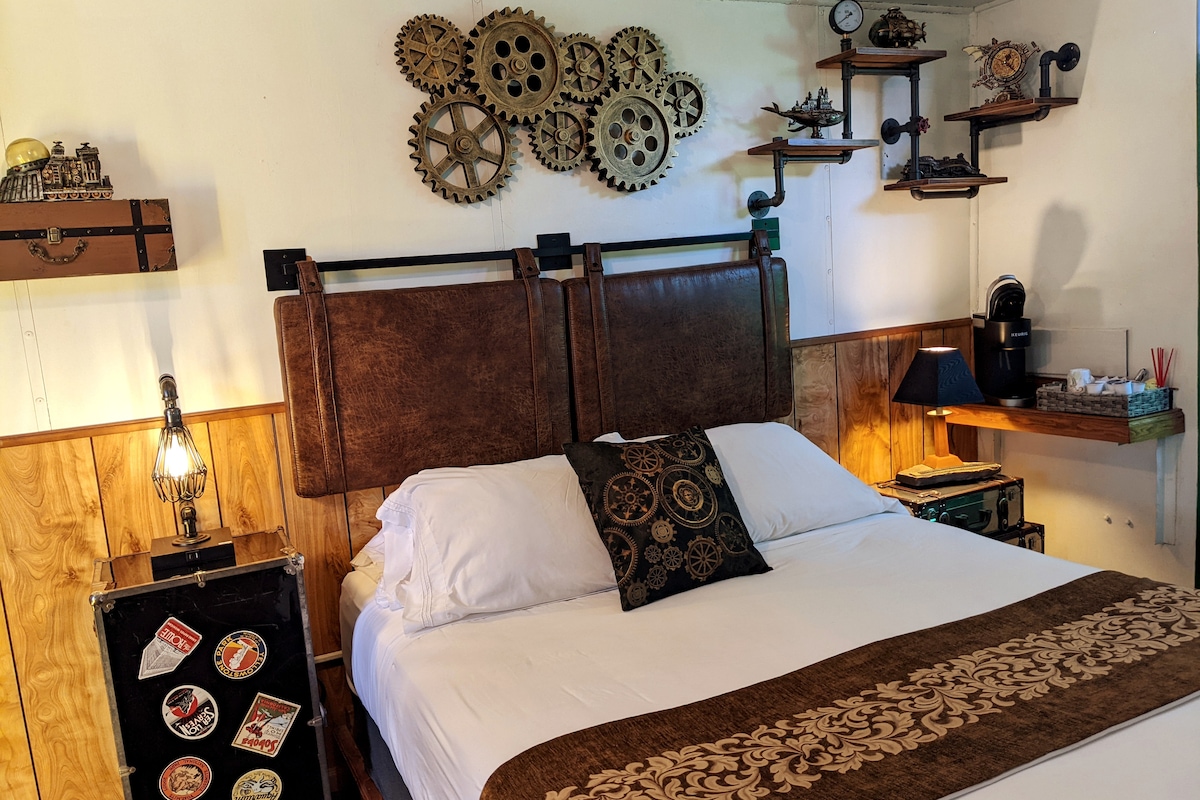 Step into a world of whimsical and imaginative adventure with this quirky steampunk-themed vacation rental. The caboose is a fascinating blend of Victorian-era aesthetics and futuristic technology, with a charming blend of cogs, gears, and brass accents. Whether you're sipping a cup of tea by the quaint, vintage-style stove, or lounging in the comfortable bed, surrounded by eccentric steampunk decor, you'll feel as if you've stepped into a magical world of adventure and imagination.