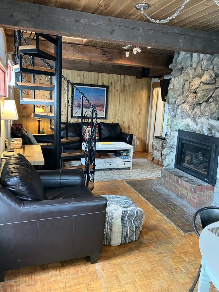 This charming A frame is so cozy! The living room, dining space and kitchen greet you right as you walk in. The house has a wonderful layout for families, with bathrooms on the main level and the walk out basement, and two living areas. There are large decks off the front and back of the house, adirondacks and picnic table allow taking in the gorgeous view and listening to the seasonal creek very comfortable. Two parking spaces and snowmobiles can be parked right off the road.