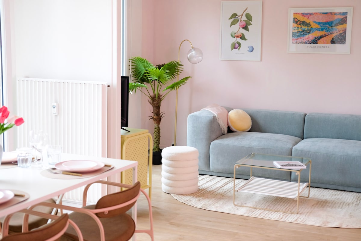 Ready to see life through rose-colored glasses? Welcome to Le Bonbon, a large unique home that will awaken your sweet cravings! Immerse yourself in a world of pastel colors and sweetness, where each corner hides a nod to the world of sweets. This creatively decorated home is full of gourmet details and offers a candy bar. Perched on the 4th floor (no elevator) – perfect for eliminating some sweets! Easy and free parking – 10 min to Mont (25 min by bike)