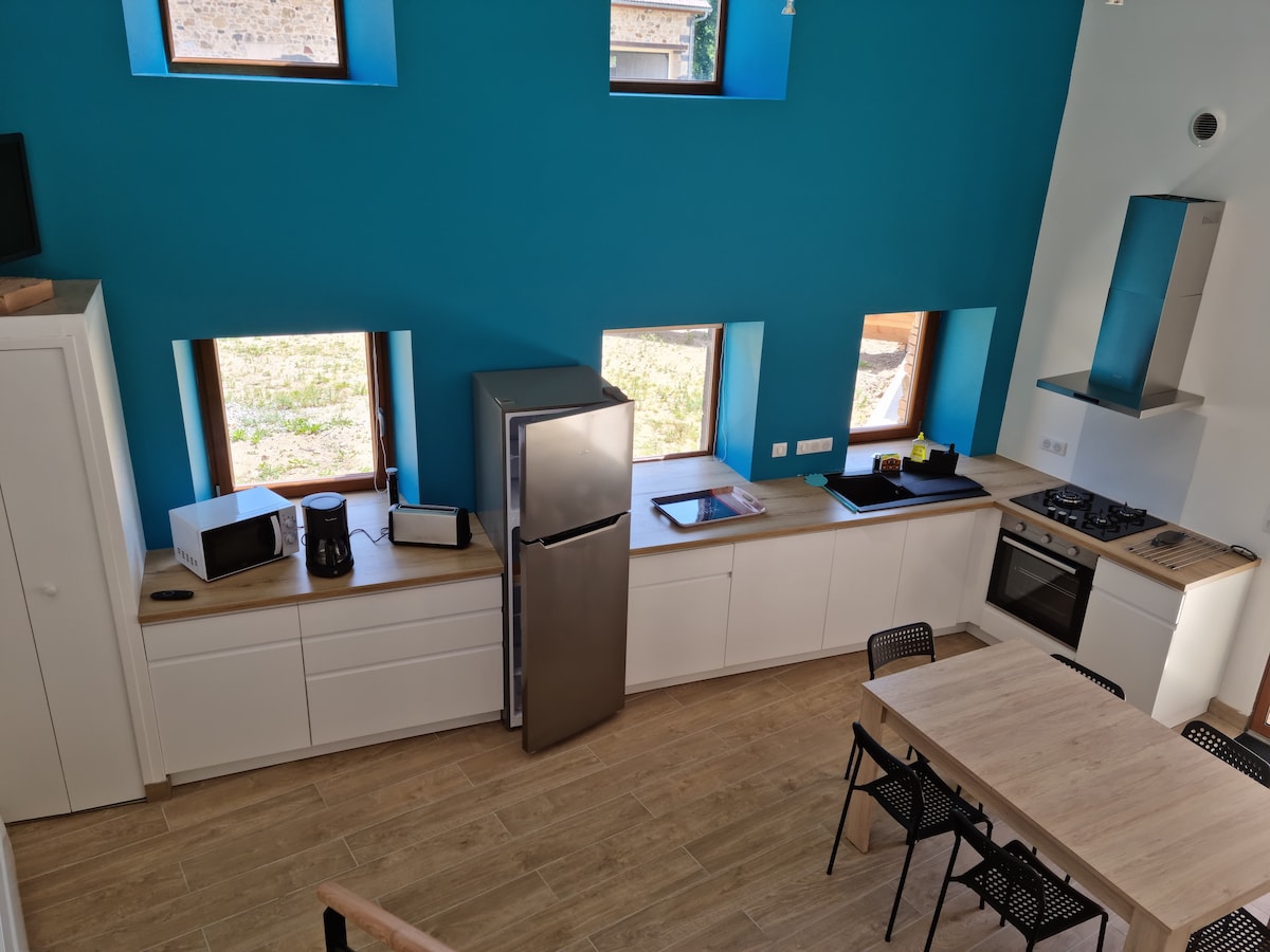 Cozy private mezzanine nest in a renovated old hotel in the heart of the village in the desertification of Rochefort Montagne, ideal for hiking, skiing, and discovering Auvergne, Sancy and the Puy mountain chain. Hot tub, air conditioning, Emperor bed (2x2m), EMMA mattress on slats, fully equipped kitchen with dishwasher, oven, microwave oven, battery of utensils, fondue, crepe, raclette, gas fires and induction hobs, SMEG refrigerator, washing machine, dryer, LG TV