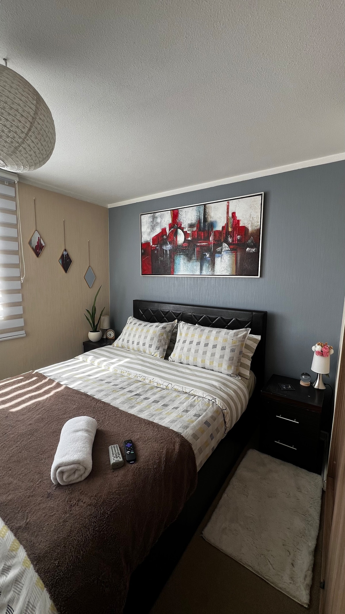 Nice new apartment, sunny, steps away from everything (mall, supermarkets, transportation, etc.) and close to downtown Concepción. Fully furnished and cozy. Equipped so that from 1 to 4 people are comfortable and feel at home. 2 bedrooms with en-suite bathrooms, 3 beds and 1 sofa bed, Wi-Fi and an equipped kitchen. It has covered parking and 24-hour security. An excellent place to rest and enjoy as a family