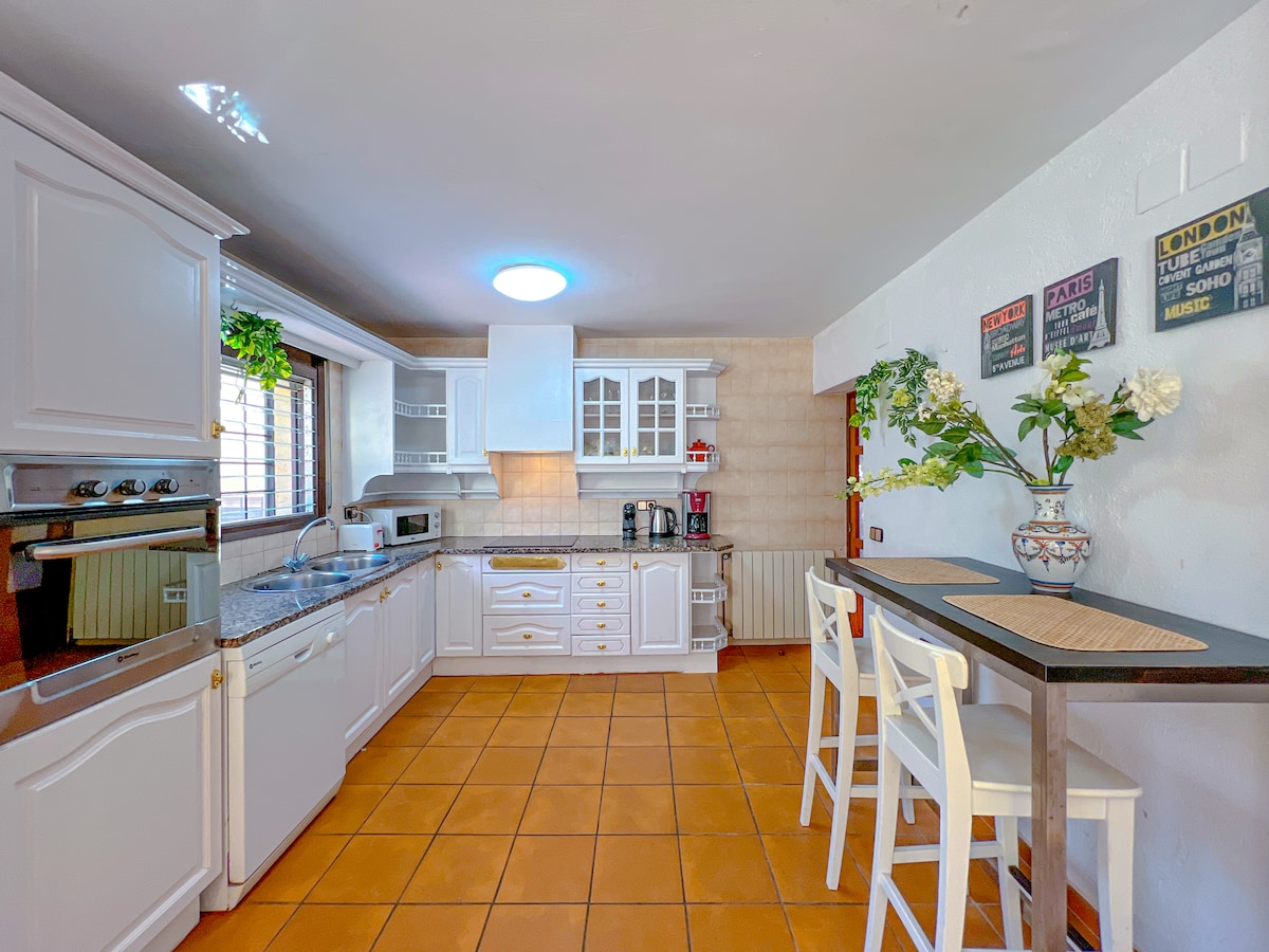 Relax with the whole family at this quiet place to stay. Spacious house, with minimalist and functional decor. It has three large bedrooms and a suite with a bathroom and a dressing room. It has a terrace on the top floor for the three bedrooms and a porch with a swimming pool just in front; both overlooking the Sea and the Mountain. It also has two garages; one to store two indoor cars and an outdoor garage for several cars, which is where there is a large outdoor area to play and where there is the barbecue.