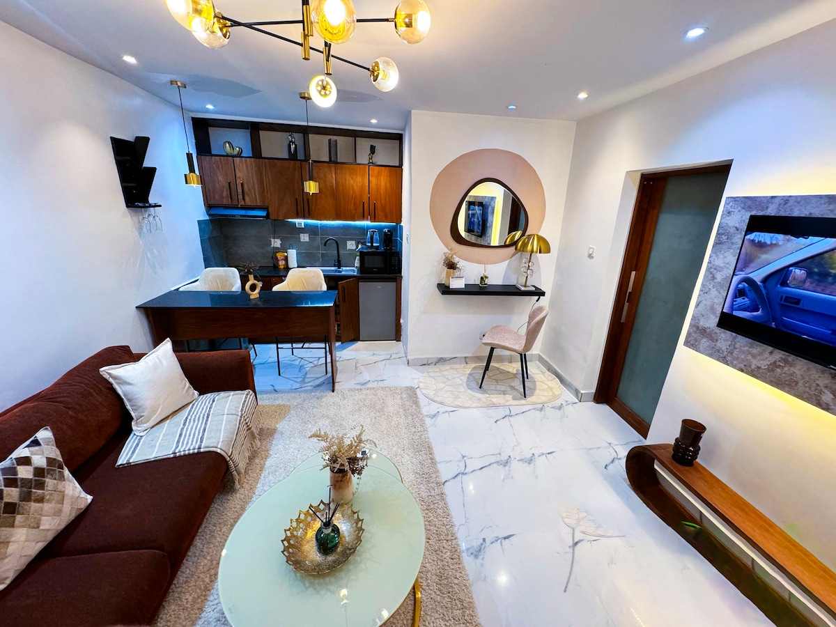 • Stunning apartment fully furnished, within two bedrooms, a living room, a kitchenette area, a bathroom and modern toilets. • It has a large 55” QLED screen with Netflix and WiFi connection. • A day and night guard, a 24/7 cleaning service, secured by an alarm system and an electric fence as well as CCTV cameras. • An electronic generator in the event of a power outage, a water batch, and a private parking.