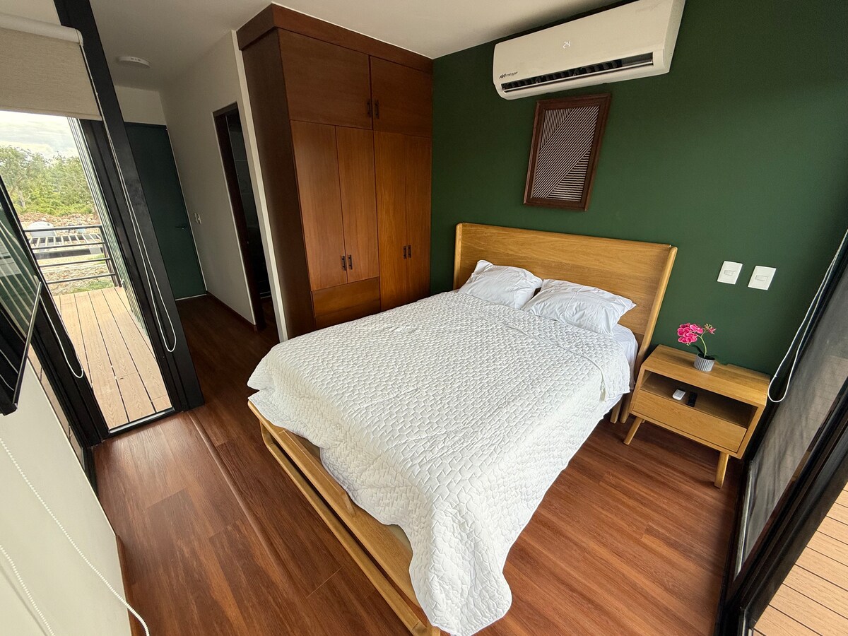 Cozy apartment in an excellent location, steps from Paseo Montejo, a tourist area of architecture and historical monuments, close to the Calle 47 gastronomic corridor, La Plancha Park, Paseo 60, the American Consulate, the ADO Bus Terminal, as well as numerous cafes, bars, restaurants, banks, and Walmart. This quiet and comfortable one-bedroom apartment is ideal for long or short stays, home office space, or relaxing. It also has a beautiful pool to cool off in after a city tour.