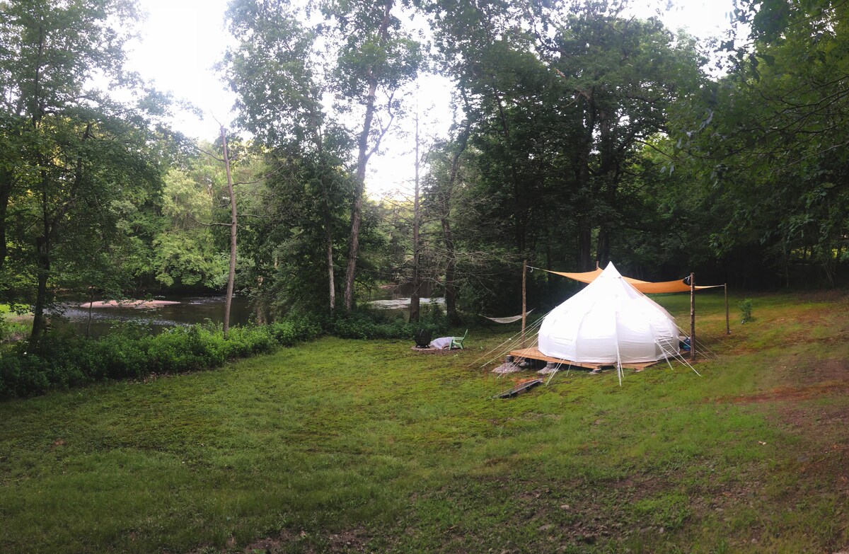 Stay on a 50+ acre historic farm just a 10 minute drive from downtown Mystic. White Clover Farm is in a wooded area of North Stonington, CT. "Pondview" is one of just a few secluded glamping sites.