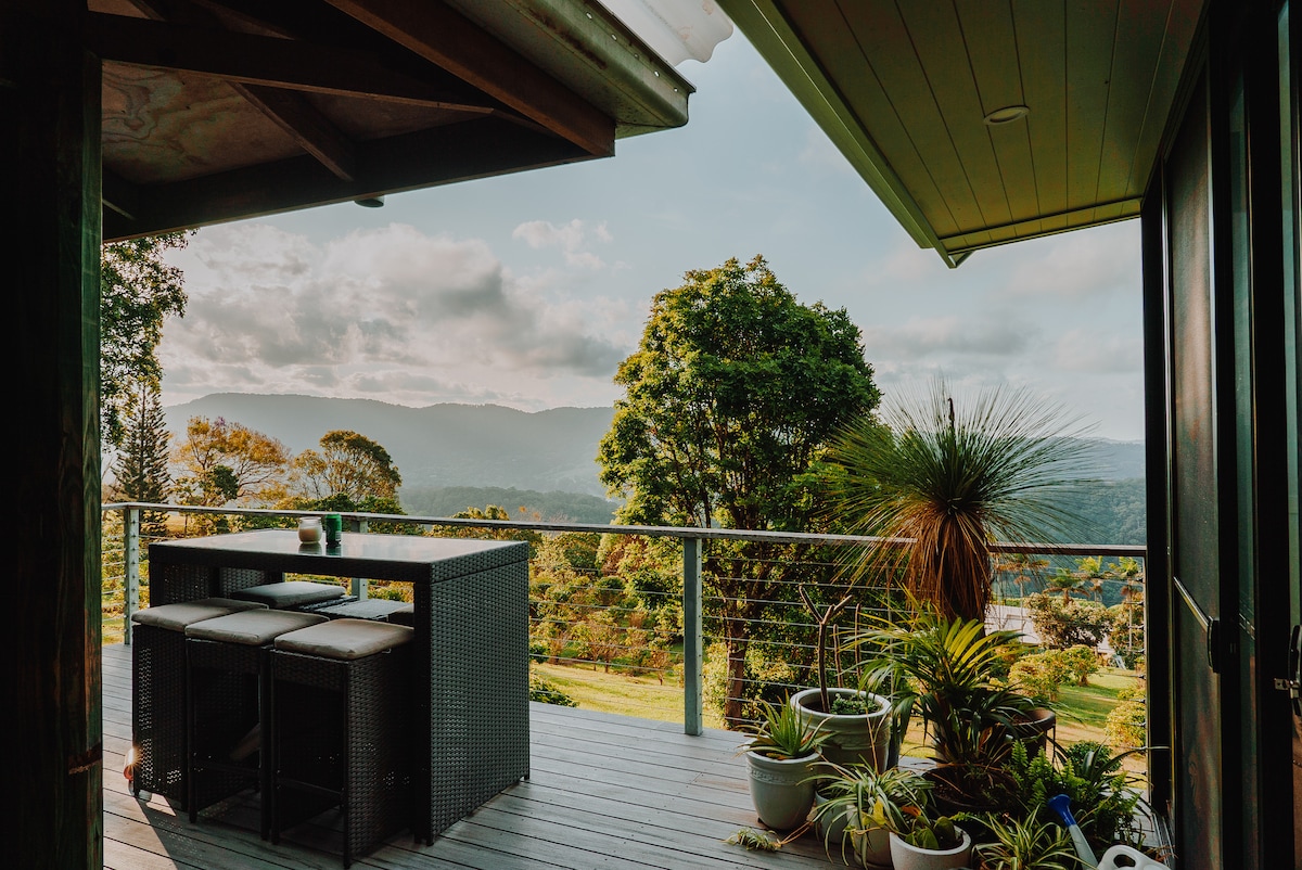 Unwind at this stunning hinterland location. This farm stay was lovingly renovated from the old coffee roasting shed and built with a coastal rustic feel. Enjoy the sea and mountain views from the large deck and surrounding coffee plantation. The Roasting Shed is located in the Tweed Valley, a locals-only spot surrounded by wildlife and fresh mountain air. A perfect break for those looking to escape the city, attend a wedding celebration or enjoy the local distilleries, restaurants & beaches.