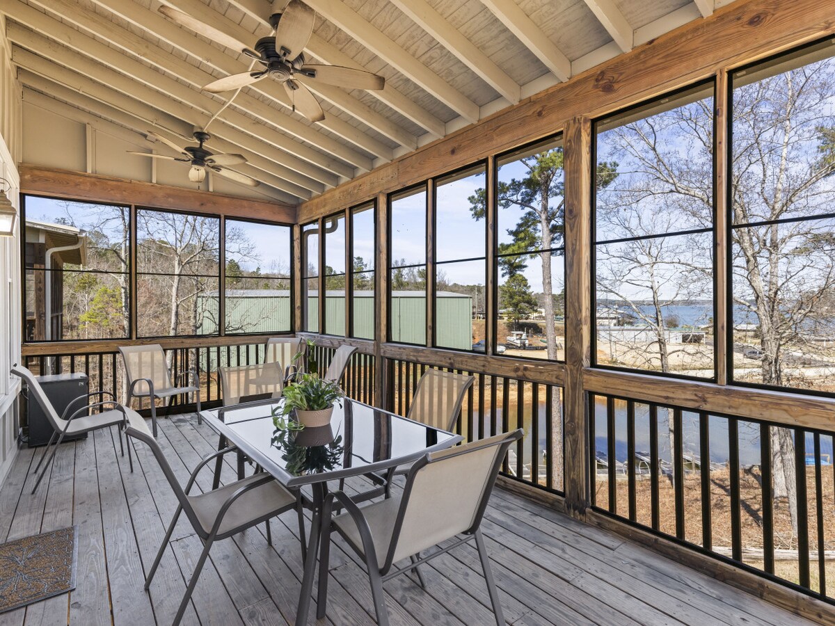 Your family vacation search ends here at this cozy cabin with 3 bedrooms, 2 bathrooms, and all the things you need for a home away from home comfort. The water is just a few steps from the screened porch. You also have use of the PWC ports and the dock for your boat, fishing, and swimming. Fire pit perfect for s’mores all year! Hungry? Start the gas grill! Meals at the farmhouse table on the screened porch, with an amazing lake view. Swim area for all ages. Make use of the 2 kayaks available.
