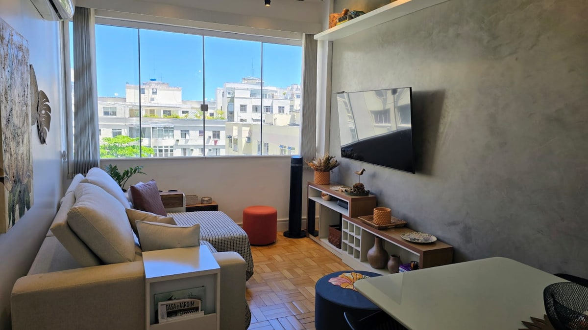 Copa Garden, a unique apartment for those who love to be well located and do not give up beauty and comfort. It has a private tropical garden, where we can revitalize ourselves after the hustle and bustle of the beaches and nights in Rio. 7 minutes from the iconic Copacabana Palace hotel and 1 minute from the subway, it is guarded among exclusive streets with private security in the heart of the neighborhood. Beautiful, charming and well-equipped, in a brand new building, with coworking space and shared laundry.