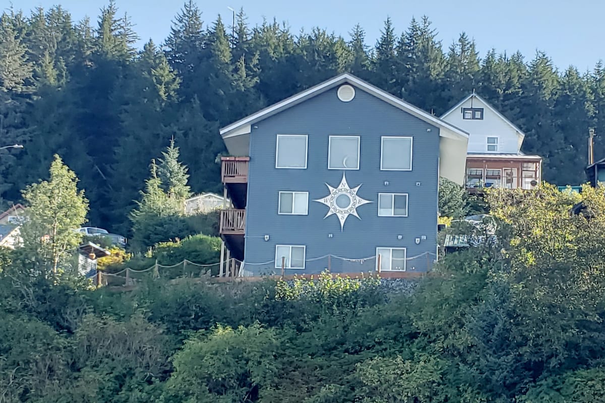 3 story newer home within 5 min of walking anywhere in down town Cordova. View home overlooking the harbor. 5 min walk to reluctant, anchor bar and grill, ok, community center, pool, bidarki gym. Master bedroom has king size bed, 2 bedrooms with queen beds, and a common playroom with twin bed. Also have a sofa in living room. Master bedroom has a soaking jacuzzi tub with window overlooking harbor. all bedrooms have views. small landscaped yard with sauna.
