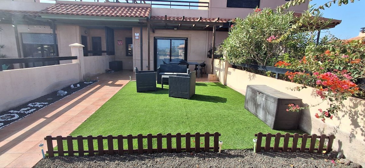 CANARY STYLE HOUSE COMPLETELY RENOVATED, 30 SEC FROM THE BEACH WITH A BREATHTAKING VIEW OF THE ISLAND OF LOBOS. Impeccable condition, superbly equipped kitchen with all accessories. Two bedrooms and a bathroom with luxury shower and an outdoor shower. Washing machine. terrace, barbecue with solarium on the second floor and private garden at the entrance. It feels like a hotel! Located 8 minutes walking distance from the National Dunes Park and 10 minutes from the city center