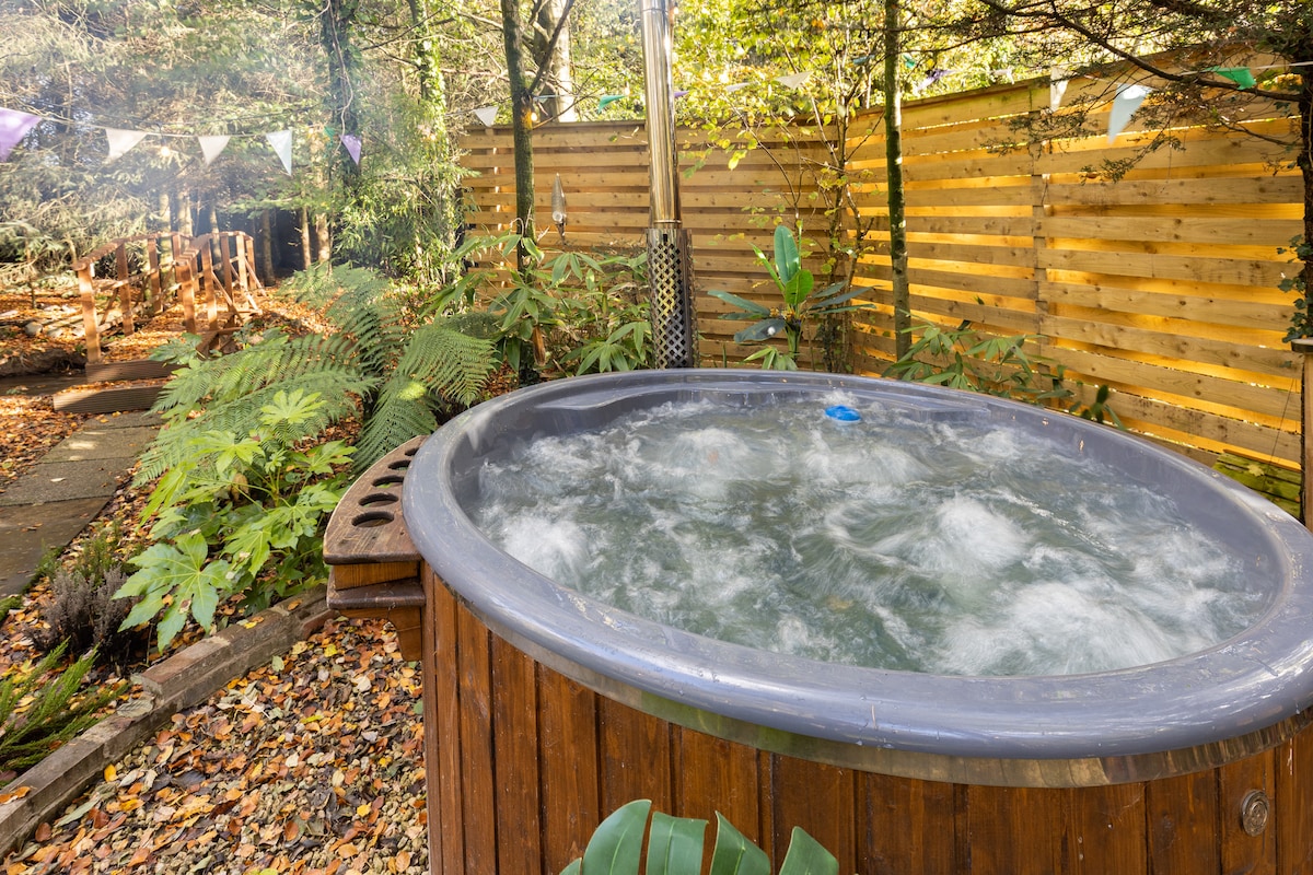 Welcome to The Captain’s Rest at FINGLEN! - Charming woodland path to your cabin (trolleys for luggage provided) - Hot outdoor double-ended bathtub - Outdoor firepits / indoor wood burning stoves - Large veranda with seating - King-size bed with luxury dressing gowns - Indoor bathroom featuring hot shower and eco composting toilet - Scenic views of wildflower meadows / river - Located near hiking trails and wild swimming spots - Eco Friendly! Solar powered, eco waterless toilet