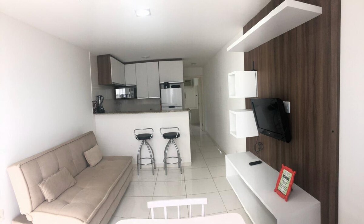 Flat Boulevard very well located, with beautiful ocean views and swimming pool, 350 meters from the beach (9 min walk). Beach service. Kitchen with electric stove, microwave, oven and basic cooking utensils. Regular coffee makers and Nespresso. One en-suite with a queen-size bed and a double sofa bed in the living room. TVs in the bedroom and living room with NETFLIX, air-conditioning in the bedroom, 300 mega Wi-Fi, 1 parking space, daily housekeeping service, restaurant for meals (not included in the daily rate). Close to the mall/downtown.