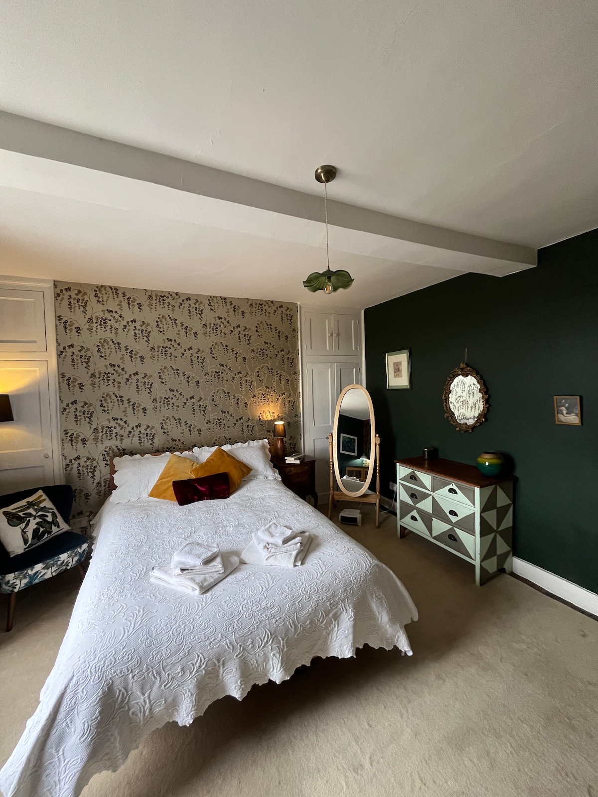 Newly refurbished, the Painswick apartment is just a short walk from Cirencester’s vibrant pubs, cafés, and shops. Its moody, maximalist Victorian style—featuring deep greens, rich purples, and touches of gold—creates a striking blend of modern comfort and classic Cotswold charm. Spanning two storeys, the Painswick sleeps four across one king and one twin room, both designed for restful sleep. The open-plan kitchen, dining, and lounge area offers the perfect space to relax and unwind.