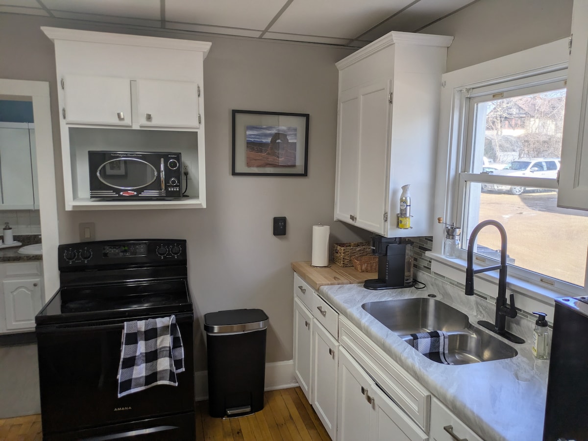 Welcome to our charming historic home in the heart of a small town! Sleeps up to 8 guests, downtown location, and fully updated. Enjoy the beauty of local life with nearby biking trail, a movie theatre, museum, boutiques, and restaurants. Plus, relax with the convenience of a fully equipped kitchen, designated workspace with WiFi, and cozy gas fireplace. Immerse yourself in the local charm and create lasting memories in this delightful getaway. *see note in house rules about service animals.