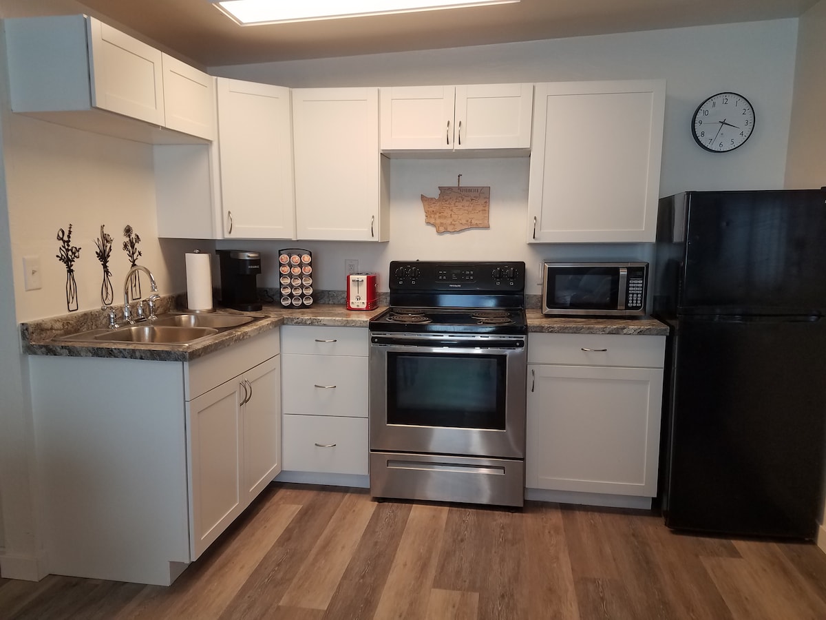 Centrally located in Moses Lake, our 2 bedroom, 1 bathroom home provides plenty of space for your travel/work needs. New floors, cabinets, appliances and more. Second bedroom has a dedicated office space, along with a twin trundle bed. Our large, fenced yard is great for pets. Extensive off-street parking for boats, campers, and trailers. Located 2 mins from the fairgrounds, 4 mins to cascade park, 12 mins to the golf course, and 45 minutes from the Gorge Amphitheater. We hope you love our home!