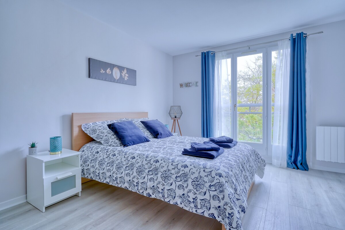 32 m2 studio, perfect for hosting up to 2 people. Located in a quiet residence, 5 minutes' walk from the train station, Le SPOT shopping center and the tram. About: Self ✦check-in from 4:00 p.m. thanks to our smart lock. Comfortable 160 x 200 cm✦ sofa bed, to relax. Fully equipped kitchen✦, washing machine for your needs. ✦Free Wi-Fi, unlimited internet access. ✦Dressing area, just like at home. Complimentary ✦coffee and tea: upon arrival, offered by the house.