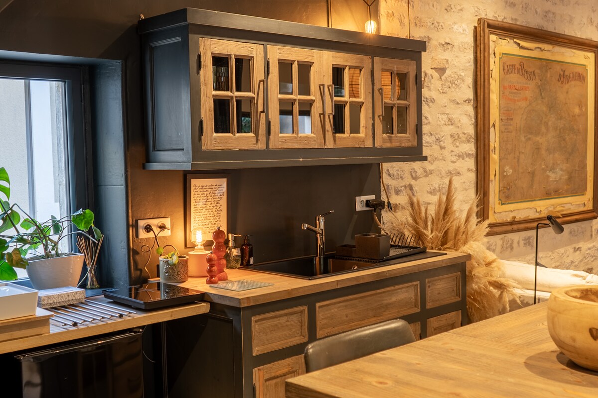 "Lovers' Nest" is the ideal place for couples seeking relaxation and zen. This fully renovated 70 m2 house has been furnished and decorated in natural shades and materials by a decor addict. This cozy cocoon is the perfect place to meet as a couple and have a good time together. The +: jacuzzi, massage room, video projector with home theater Beautiful services, tasteful decor and pretty materials such as polished concrete, linen, organic cotton...