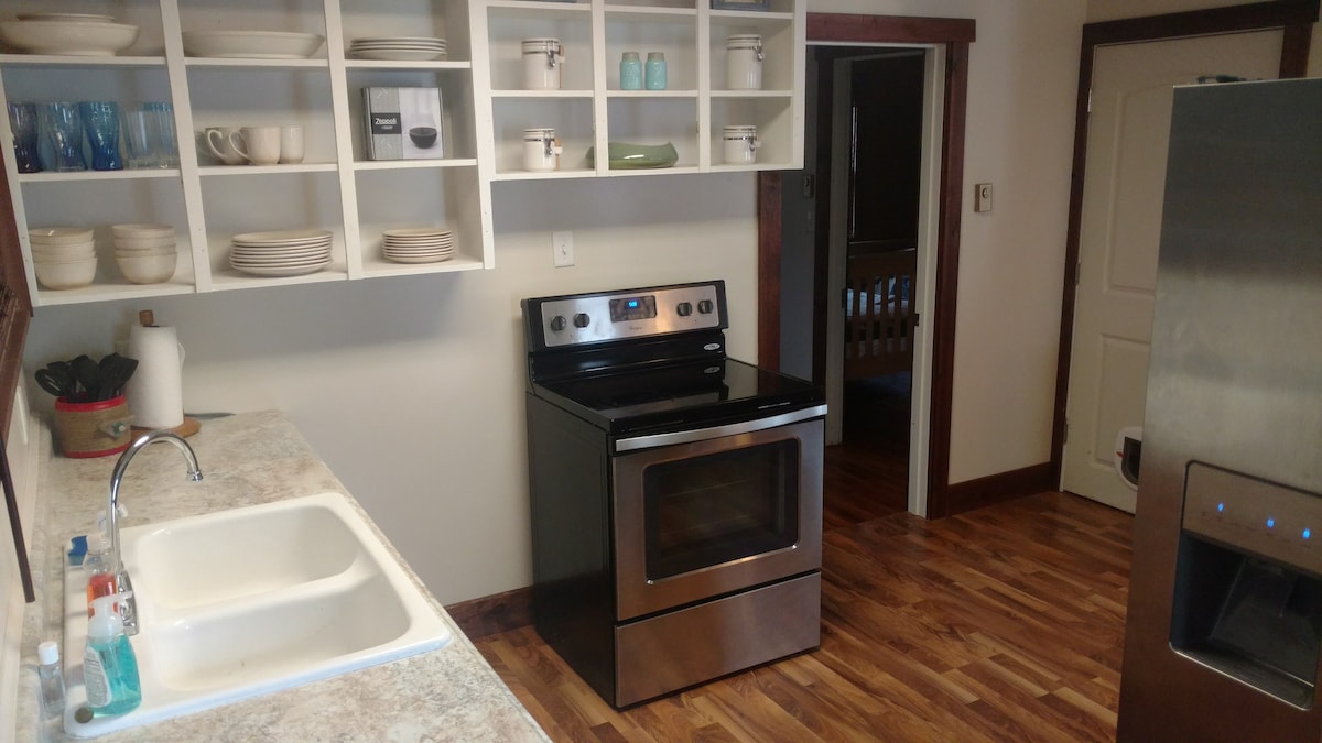 1200 sq ft ranch style house w 2 bedrooms, 1 bath. Main bedroom has 1 queen size bed, 2nd bedroom has twin size bunk beds w twin size rollaway bed which enables a total of 5 guests. Appliances available for use are stackable washer/dryer, fridge, stove, over the range microwave, and dishwasher. Newer propane grill is available for use. *bunk bed will be difficult for older individuals due to lower bunk being low. Bunkbeds are really designed for smaller children.