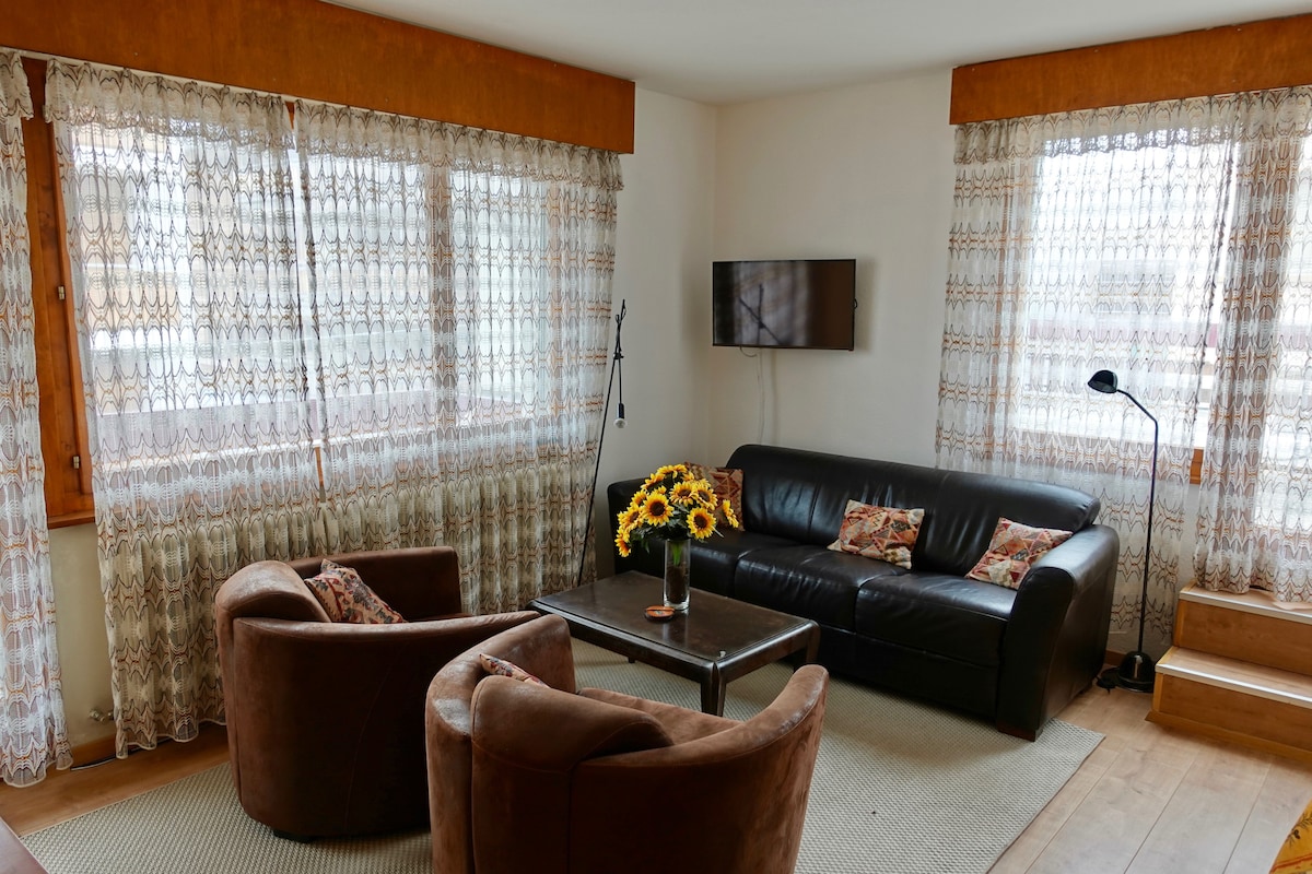 Center of Montana in pedestrian street. Cozy apartment with convenient access. 4 people. 5 min. walk to the funicular and Arnouva-Gd Signal cable car. 2 bedrooms each with 2 single beds, bright living room, kitchen, bathroom, terrace (42 m2), balcony, ski locker, Wi-Fi. From December 21, 2024 to March 1, 2025: minimum stay of 7 days, from Saturday to Saturday. Cleaning fee is included in the rental. Sheets and towels to bring or rent (35 CHF/pers.)