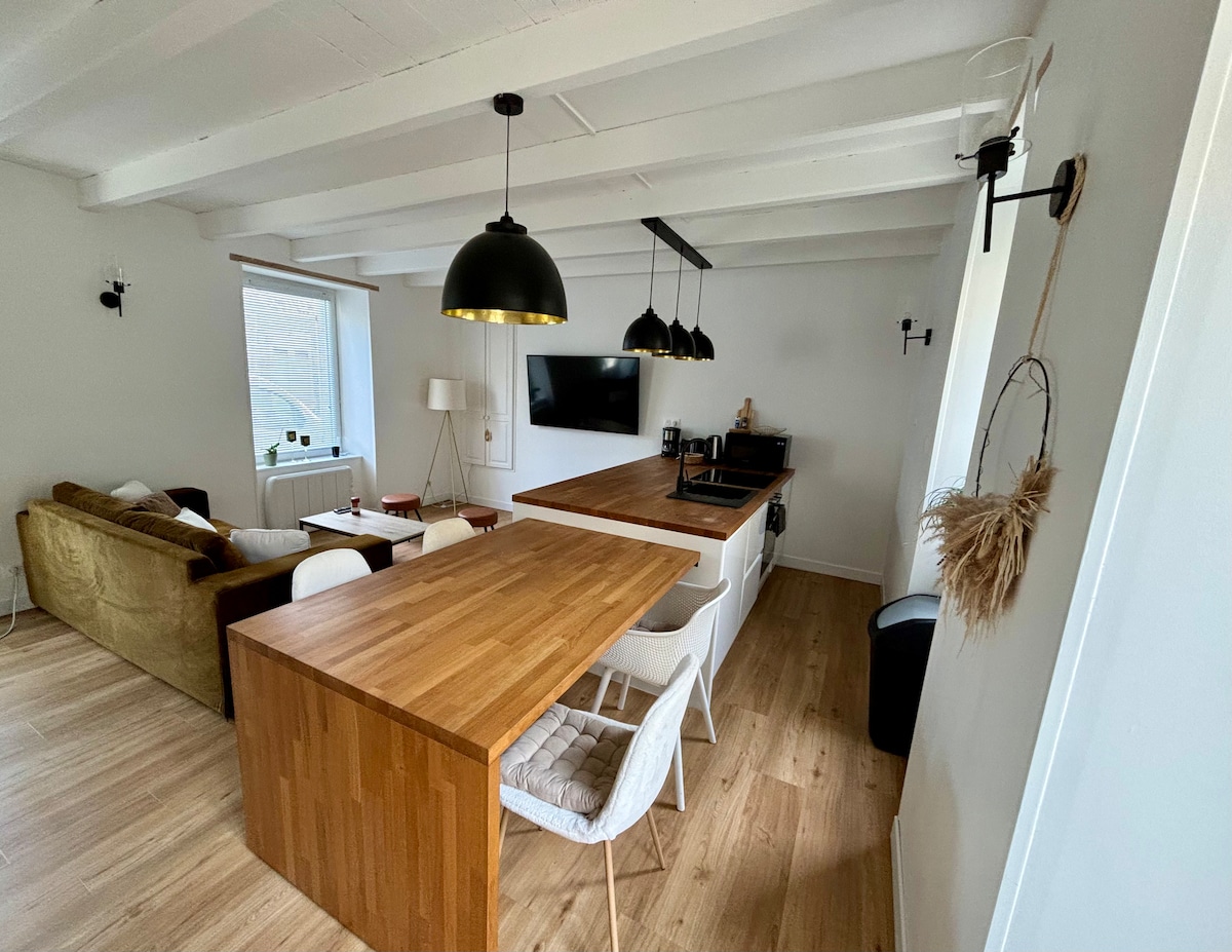 Close to the sea (1 km) as well as the city center with all its amenities (700 m), we rent a furnished property located on our land next to the house in a former garage with its small terrace. On the ground floor, entrance to the main room including a fitted and equipped kitchen with its dining area. Toilet. Shower room. Upstairs, a bedroom (140 bed) and mezzanine (TV area). No Wi-Fi. Ideal for fishermen, hikers, nature lovers...