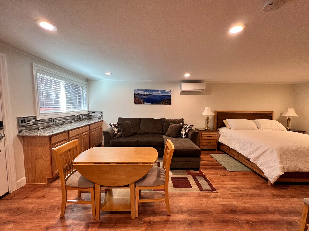 Lakefront with beautiful view across Agency Lake to the mountains surrounding Crater Lake! This upstairs apartment has one good sized bedroom, with skylights, a desk area and a flat screen TV. A full kitchen is stocked with dishes, pots and pans, glasses and silverware, plus extras. A hide-a bed sofa is in the living room, with a comfortable reading area. The bathroom has a stand up shower. Loaner kayaks in summer months, sled in winter. 30 minutes to beautiful Crater Lake park boundary.