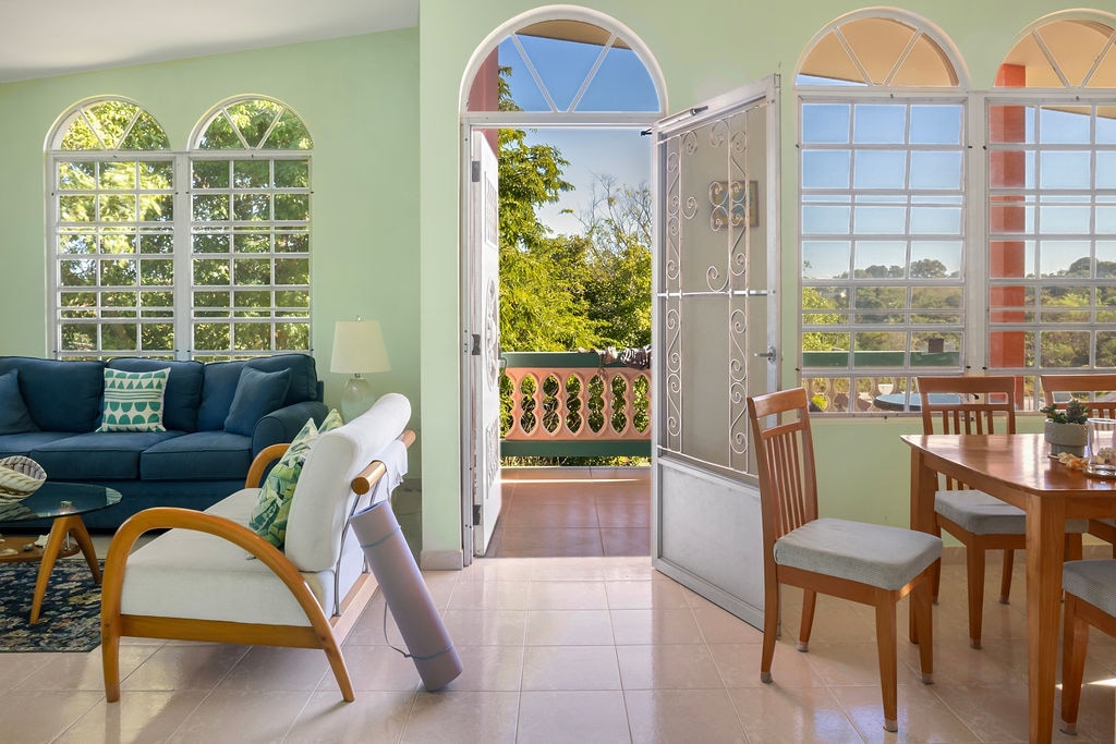 Mountain breezes and views are endless at this newly renovated hilltop home in Rincón's Barrio Cruces. Casa Cruces offers all the perks of Rincón: Mountain-living tranquility only 10 minutes to beaches and surf breaks. With backup power and water, you can vacation and reside in uninterrupted island culture. The balconies and large windows bring the views to you at every glance. Gated saltwater pool for aquatic fun. Main bedroom has a king bed, guest rooms have queen beds. WiFi: 600 mbps.