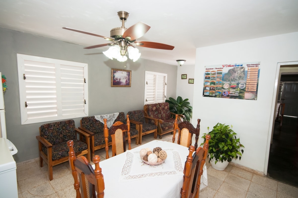 LOOK NO FURTHER, YOU'VE FOUND PARADISE. A UNIQUE COUNTRY HOUSE ACCOMMODATION, WITH A PRIVATE ROOM. A TROPICAL ENVIRONMENT AND A FAMILY ENVIRONMENT THAT WILL MAKE YOU FEEL AS IF YOU WERE IN YOUR PRIVATE HOME. VIEWS OF THE VALLEY FROM ALL CORNERS OF THE TERRACE. ALL KINDS OF IDEAL EXPERIENCES FOR HORSEBACK RIDING OR WALKING THROUGH THE VALLE DE VIÑALES, TRIPS TO OUR BEACHES, BICYCLE TOURS, BREAKFAST, DINNER, RUM, TOBACCO, AND TRADITIONAL DRINKS.