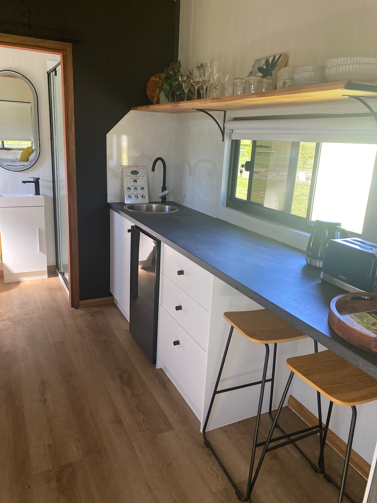 This beautiful shipping container tiny home is wonderful for people who love nature, animals and walking in the bush. This rustic tiny home is architecturally designed and constructed almost entirely of recycled materials gathered from house demolitions. Situated in an amazing location overlooking large lawns and a pond with sea views only 20mins from the cbd. We would love to share our quirky home with you. We also rent space for parties and weddings at a higher cost per night. Just ask