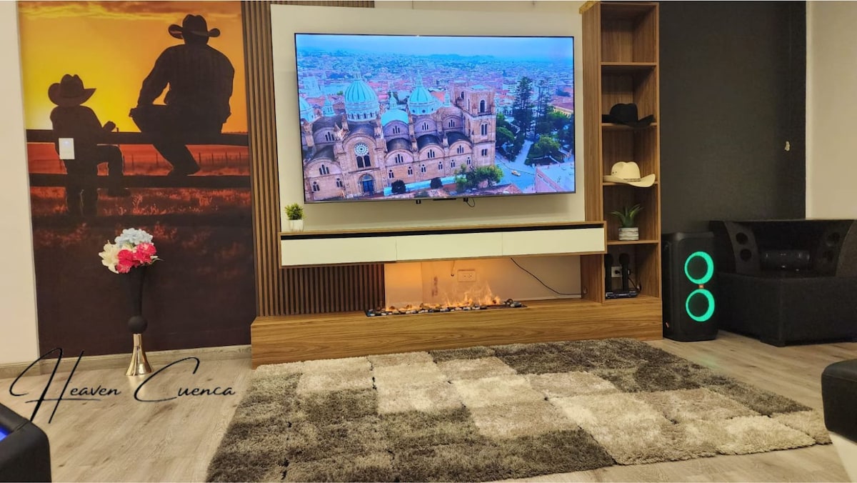 Heaven Cuenca, creado para brindar LUJO y confort, nuestra habitación cuenta con una cama equipada con sistema de audio Bluetooth, sillon de masajes donde vivieras una experiencia inolvidable,cocina de ensueño con toques Amareto con negro brillante full equipada ademas consta de una terraza con una vista privilegiada 360 donde podras admirar la catedral, Turi y un magnífico atardecer, en nuestra terraza tiene una parrila BBq, una salal equipada Vive la experiencia! Capacidad 4 personas