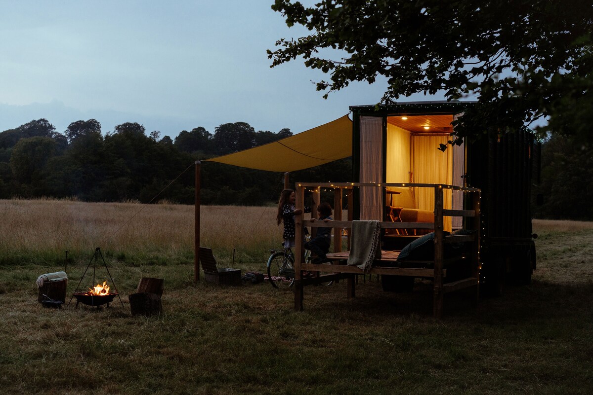 This luxury converted Bedford tk horsebox is sited in the meadow of Little low Haugh, just 0.9 miles from Morpeth.With stunning panoramic views of ancient woodland enveloping the quiet little spot it sits in. This classic Tk has been described as a cottage on wheels, with handmade furnishings, hot shower, wood burning stove, gas hob, and lighting throughout. The sleeping area is a double bed with luxury bedding. Firewood is provided as well as fire pit with all BBQ equipment. Hot tubs available.